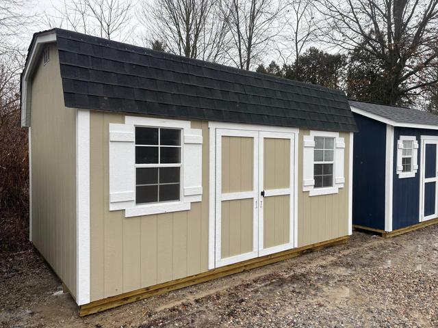 #34 -10x12 Gable, tan paint, beige trim, weather wood shingles.