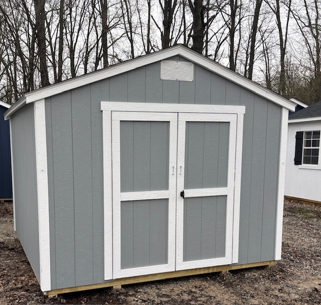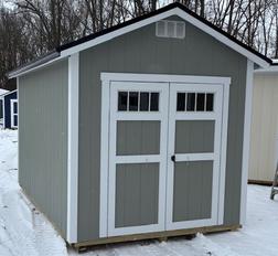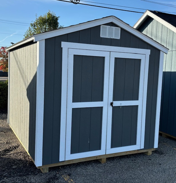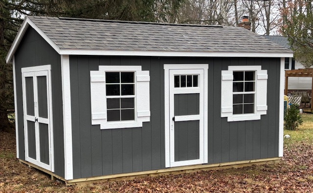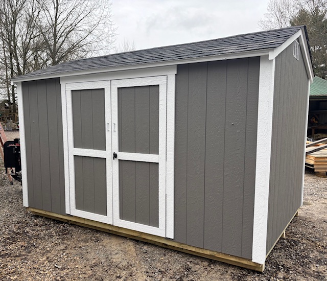 #55-8x12 Gable, med gray, white trim, black shingles.