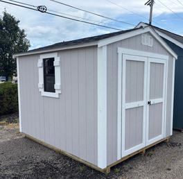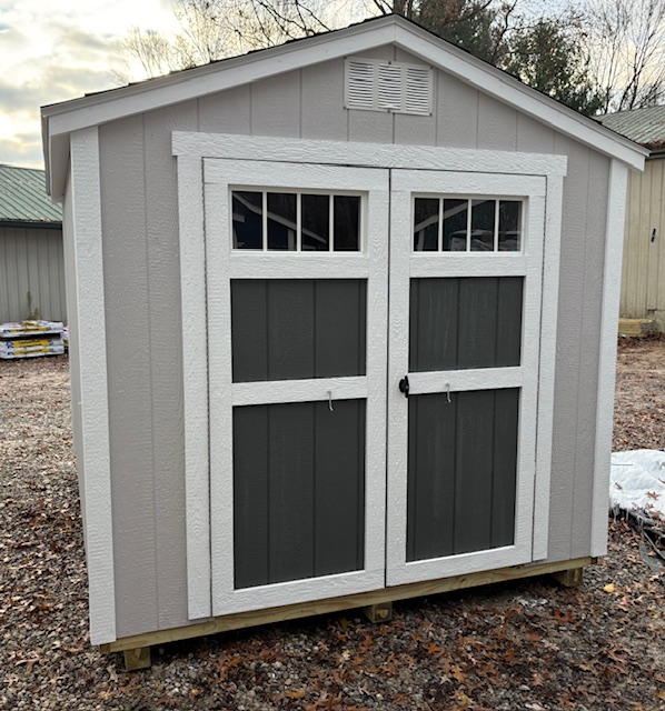 #60 -8x10 Gable, window, light gray paint, white trim, gray gray shingles.