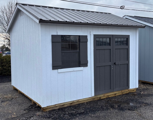 #68 -8x10 Gable, white paint, bronze doors, burnished slate metal roof.