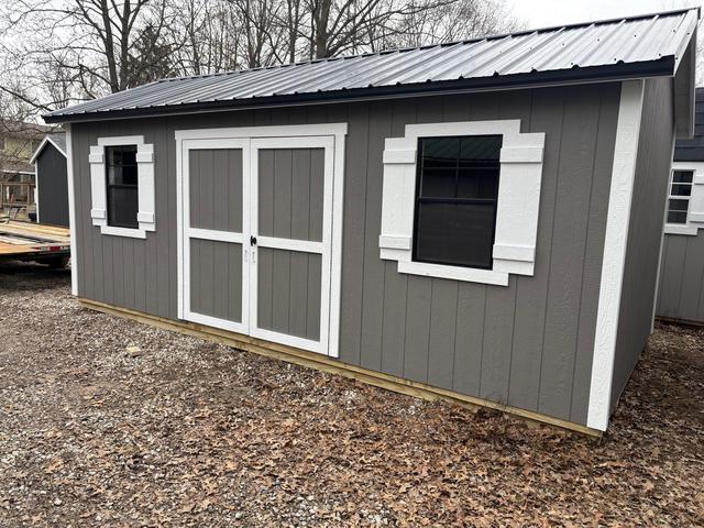 #61 -10x20 cottage , 2 windows, 6' wide pair doors, 2 lofts, gray paint, white trim, black metal roof