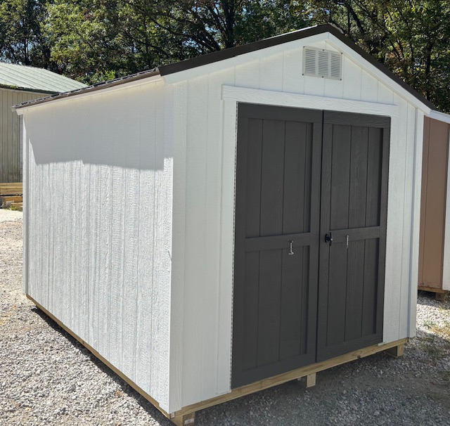 #54 -10x10 Gable, A. gray paint, White trim, black shingles.