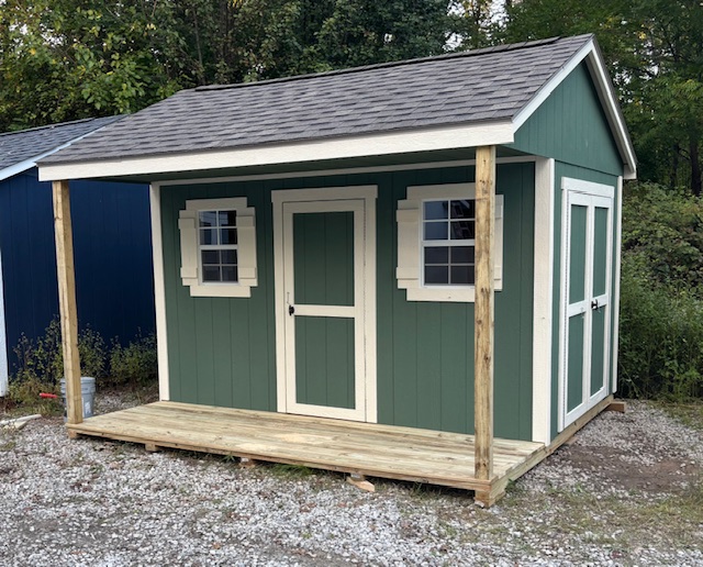 #66-8x12 Creek Cabin, 2 windows , 2 lofts, sage paint, antique trim , porch