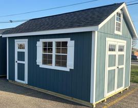 #30 -10x16 Grand Barn, 2 windows, shutters, 2 lofts, Clay, white trim, black shingles