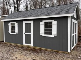 #21-10x16 cottage, 2 windows, single transom door, 2 shelves, 2 lofts, dark gray, white trim, weathered wood shingles