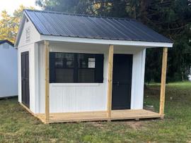 #65-10x12 Creek Cabin, 3 windows,5' transom window in back , 2 lofts, white, black accents , black metal roof porch
