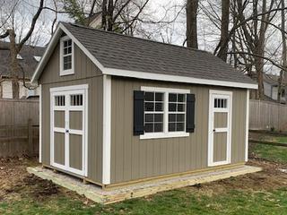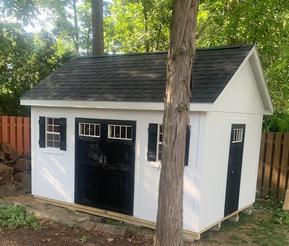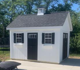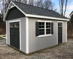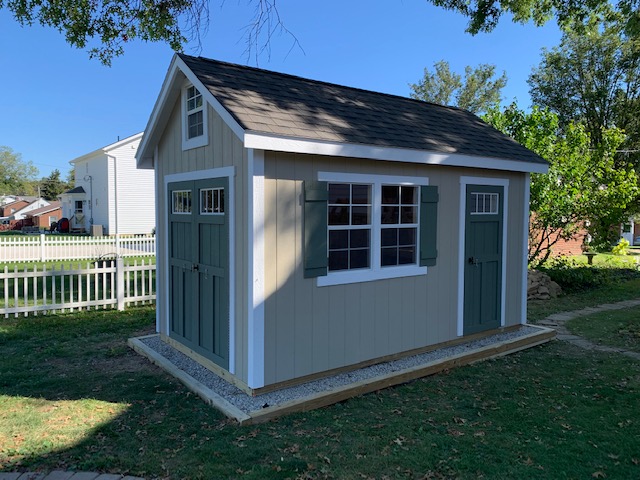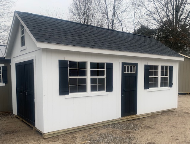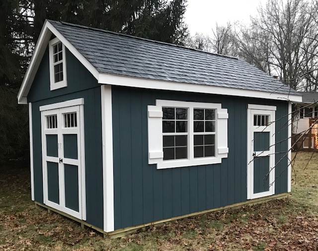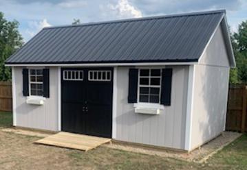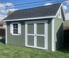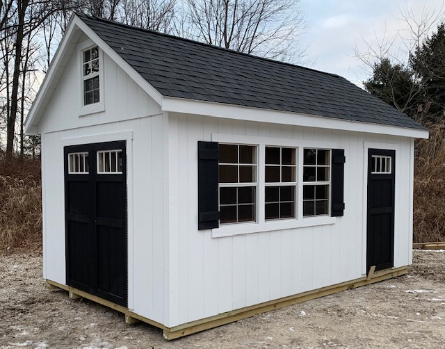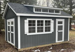 The Pendenza features an elegant 8/12 roof pitch. This attractive structure adds to any landscape with clean lines and classic style. It is our tallest shed with a generous loft area. includes 7' sidewalls, 2 loft areas, a full ridge vent, a pair of doors, a single door & 2 windows. Optional transom windows in doors and gable windows pictured.